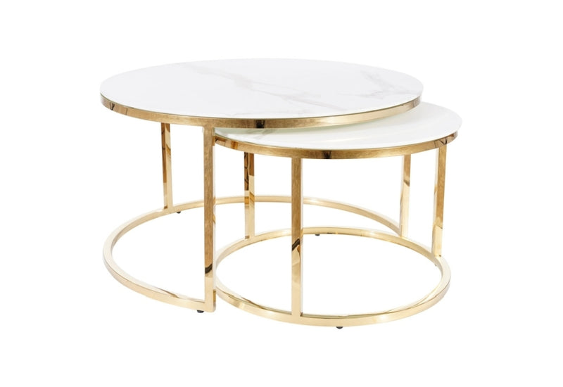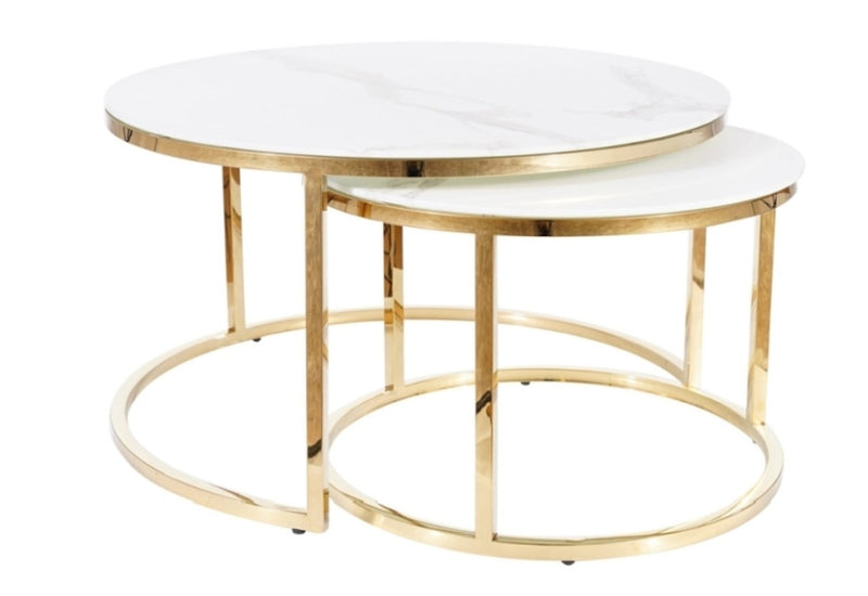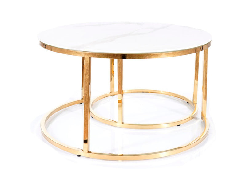 Set konferenčných stolíkov MOUSE. Skladá sa z dvoch okrúhlych stolíkov s odlišnými rozmermi. Na konštrukciu z nerezovej ocele v zlatom prevedení sú položené dosky z tvrdeného skla v dekore mramoru. Pokiaľ menší stolík nepoužívate, pohodlne ho zasuňte pod väčší. Skvelý dizajnový prvok do obývačky i kancelárie.