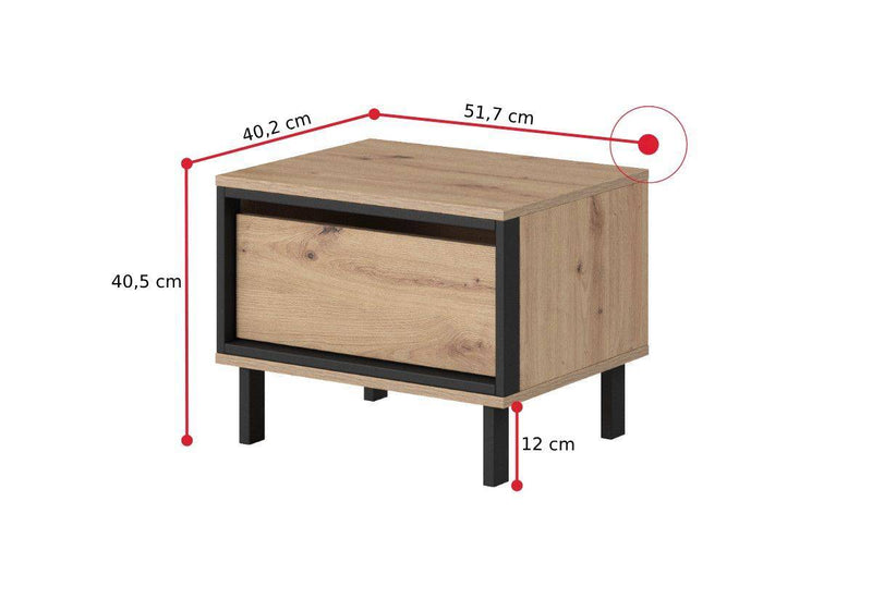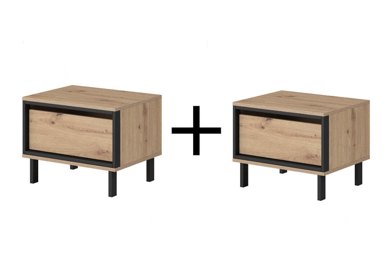 Set nočných stolíkov LASANO. Zaujme moderným dizajnom, kvalitným spracovaním. Set obsahuje dva nočné stolíky. Stolíky sú vyrobené z kvalitného materiálu a opatrené ABS hranami, ktoré chránia pred mechanickým poškodením a vlhkosťou. Ponúka úložný priestor v podobe jednej zásuvky, ktorá je opatrená úchytom. Stolíky stoja na čiernych kovových nožičkách. Kombinovať môžete s ďalšími produktmi z radu LASANO.