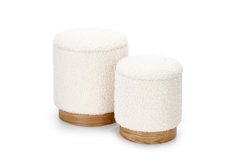 Set taburetov CUNA. Základ taburetu v škandinávskom štýle tvorí kombinovaný materiál kvalitného lamina a dyhy. Telo taburetu je potiahnuté látkou bouclé, ktorá mu dodáva výrazný štýl. Bouclé je plošná textília tvorená malými očkami, vďaka ktorým je materiál jednoduchý na údržbu a príjemný na dotyk. Praktickosť a funkčnosť zaistí úložný priestor. Sedák ponúka mäkké a pohodlné polstrovanie. Balenie obsahuje dva kusy taburetu v dvoch rozmeroch.