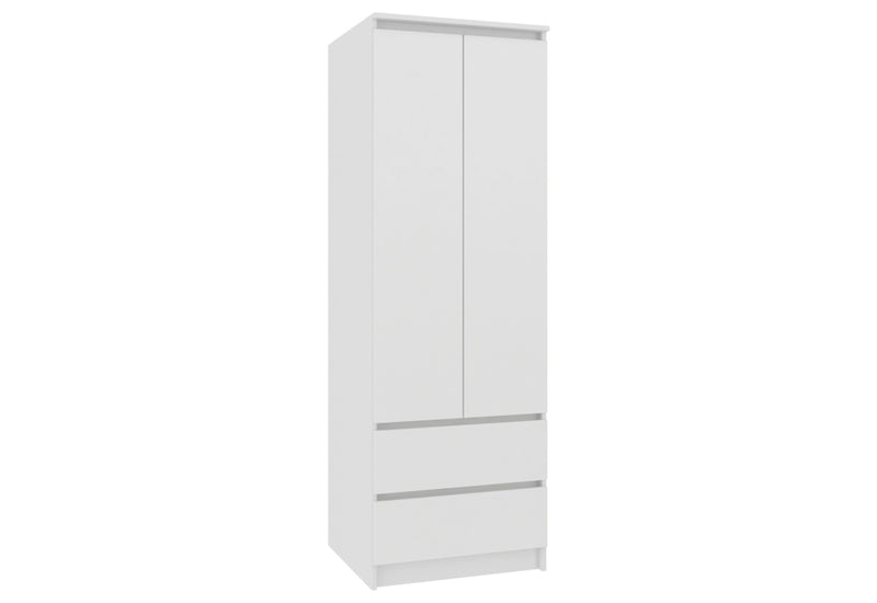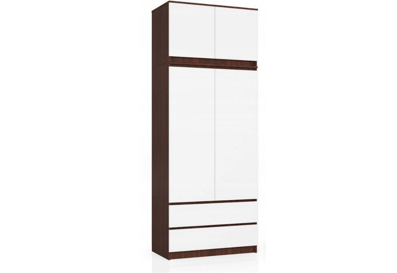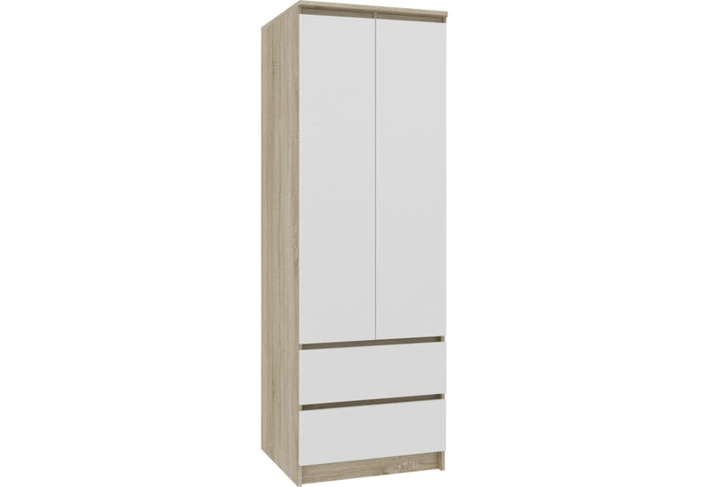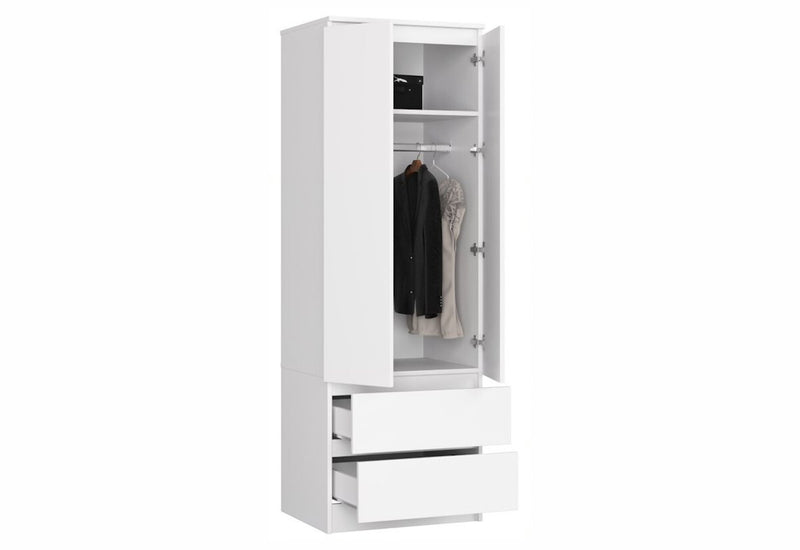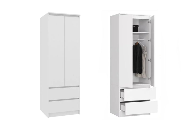 Skriňa ESTRELLA. Je vyrobená z kvalitného materiálu hrúbky 1,6 cm. V spodnej časti skrine sa nachádzajú dve zásuvky. Samotné vnútro skrine tvorí šatníková tyč nad ktorou je umiestnená nízka polička. Dvojdverová skriňa je v ponuke v niekoľko farbách.