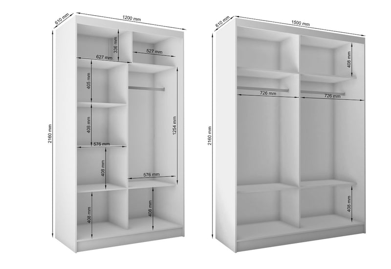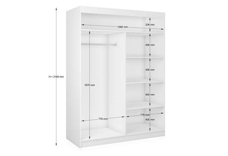 Skriňa s posuvnými dverami a zrkadlom ROBERTA. Je vyrobená z vysokokvalitného materiálu s priemerom 1,6 cm. Vo vnútri šatníka je dostatok úložného priestoru v podobe šatníkových tyčí a políc. Šatníková skriňa je zakrytá posuvnými dverami so zrkadlom na vonkajšej strane. Šatníková skriňa je k dispozícii v šiestich šírkach. Počet políc, šatníkových tyčí a umiestnenie zrkadla sa líši v závislosti od vybranej možnosti. Vybrať si môžete aj z niekoľkých dekorov.