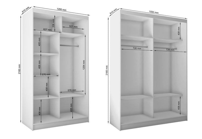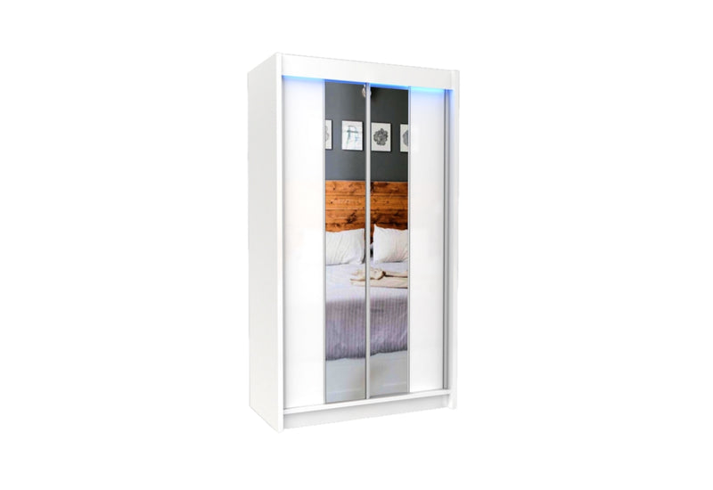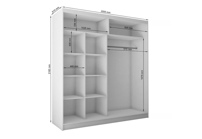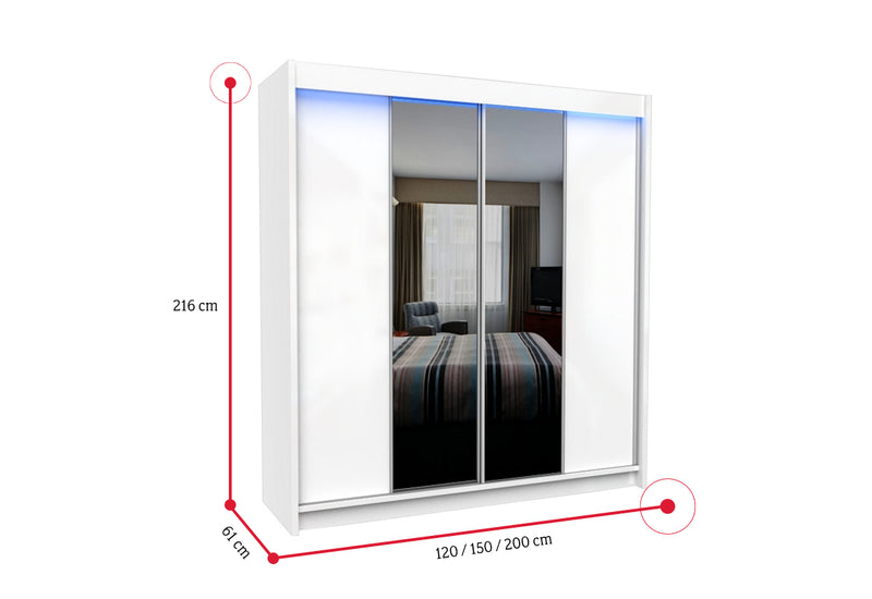 Skriňa s posuvnými dverami a zrkadlom TOMASO. Je vyrobená z vysokokvalitného materiálu s hrúbkou 1,6 cm. Vo vnútri šatníka je dostatok úložného priestoru v podobe šatníkových tyčí a políc. Šatníková skriňa je zakrytá posuvnými dverami so zrkadlom na vonkajšej strane. Šatníková skriňa je k dispozícii v troch šírkach. Počet políc, šatníkových tyčí a umiestnenie zrkadla sa líši v závislosti od vybranej verzie. Vybrať si môžete aj z niekoľkých dekorov.
