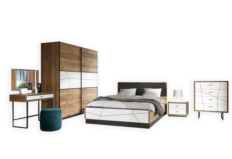 Spálňová zostava BRONO. Spálňová zostava Vás zaujme jednoduchými modernými líniami. Je vyrobená z kvalitného materiálu. Skladá sa zo zrkadla, posuvnej šatníkovej skrine, nočného stolíka, manželskej postele a komody. Pri posteli je na výber z viacerých rozmerov spacej plochy. Zakúpiť môžete spolu s ďalšími produktmi z radu BRONO.