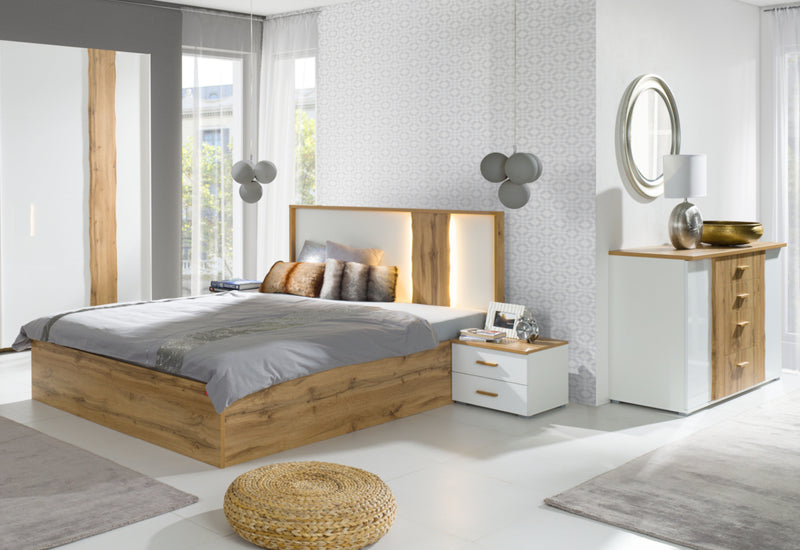 Spálňová zostava GLUME. Je vyrobená z kvalitného materiálu a vybavená ABS hranou. Tá ju chráni pred mechanickým poškodením a vlhkosťou. Skladá sa z manželskej postele so spacou plochou vo veľkosti 160x200 cm, kombinovanej komody a dvoch nočných stolíkov. Posteľ je dodávaná bez roštu aj bez matraca. Zaujímavým dizajnovým prvkom je určite členené čelo postele, ktoré je doplnené o LED osvetlenie. Dizajn zostavy vhodne kombinuje bielu farbu s dekorom dreva dub wotan.