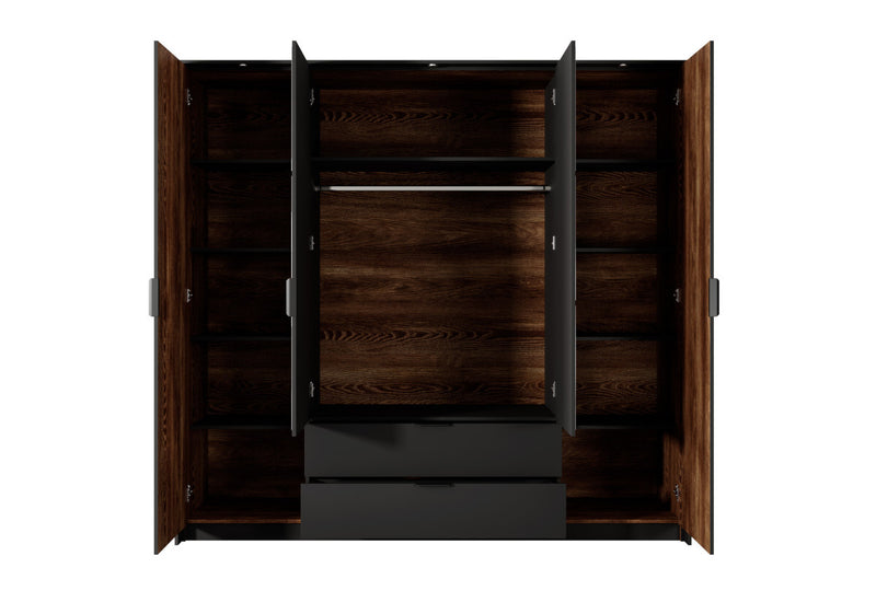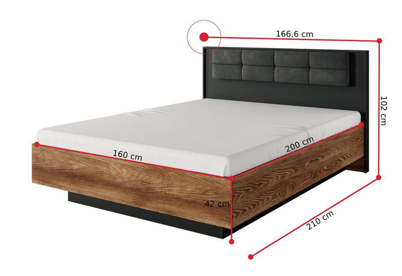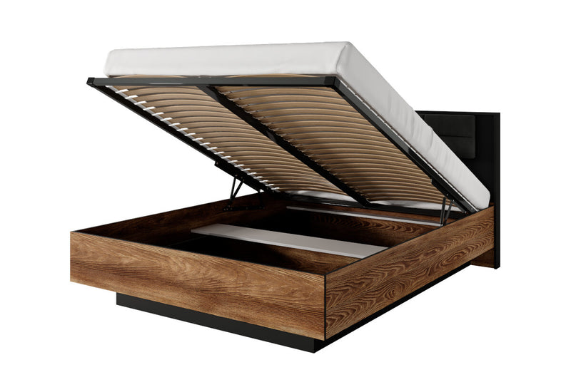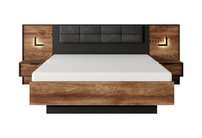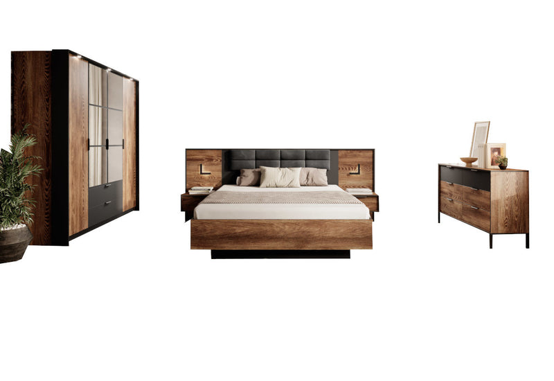 Spálňová zostava LINTON. Vyrobená je z kvalitných materiálov a vybavená ABS hranou. Tá chráni pred mechanickým poškodením a vlhkosťou. Skladá sa z manželskej postele s úložným priestorom a so spacou plochou vo veľkosti 160x200 cm, komody, šatníkovej skrine a dvoch nočných stolíkov. Skriňa a nočné stolíky sú s LED osvetlením. Posteľ je dodávaná s roštom, bez matraca. Pre ľahkú manipuláciu je opatrená úchytmi. Produkty je možné zakúpiť aj jednotlivo, čím si môžete spálňu poskladať podľa svojho uváženia.