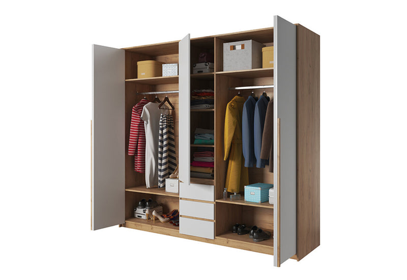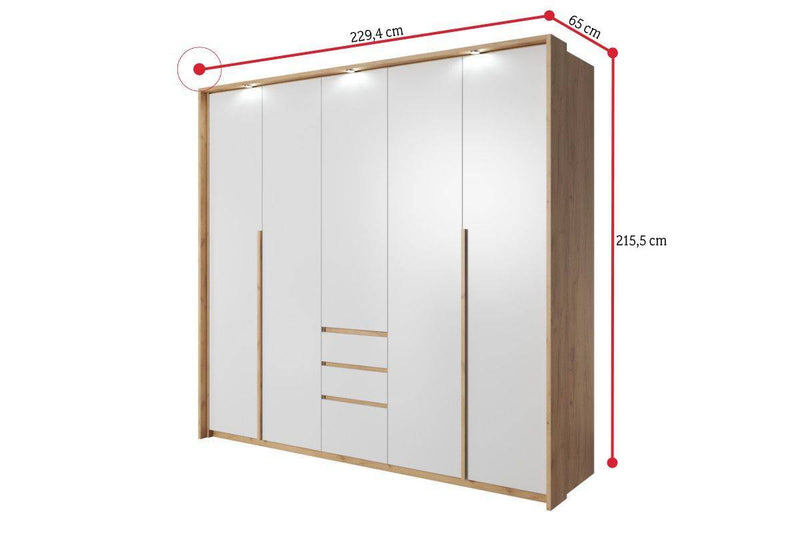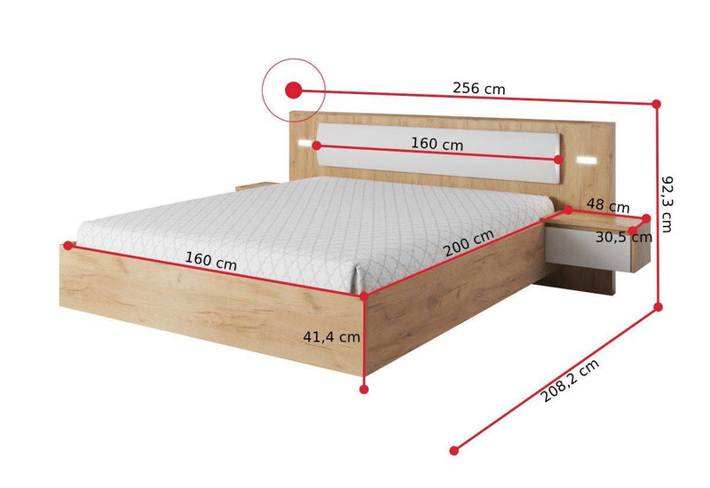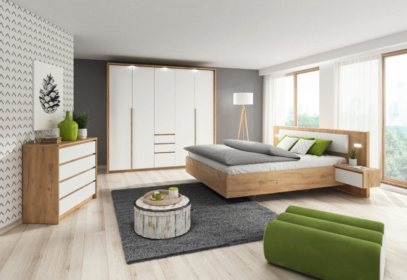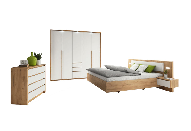 Spálňová zostava LOXEN. Vyrobená je z kvalitného materiálu a vybavená ABS hranou. Tá chráni pred mechanickým poškodením a vlhkosťou. Skladá sa z manželskej postele so spacou plochou vo veľkosti 160x200 cm, komody, šatníkovej skrine a dvoch nočných stolíkov. Skriňa a posteľ sú s LED osvetlením. Posteľ je dodávaná s roštom, bez matraca. Produkty je možné zakúpiť aj jednotlivo, čím si môžete spálňu poskladať podľa svojho uváženia.