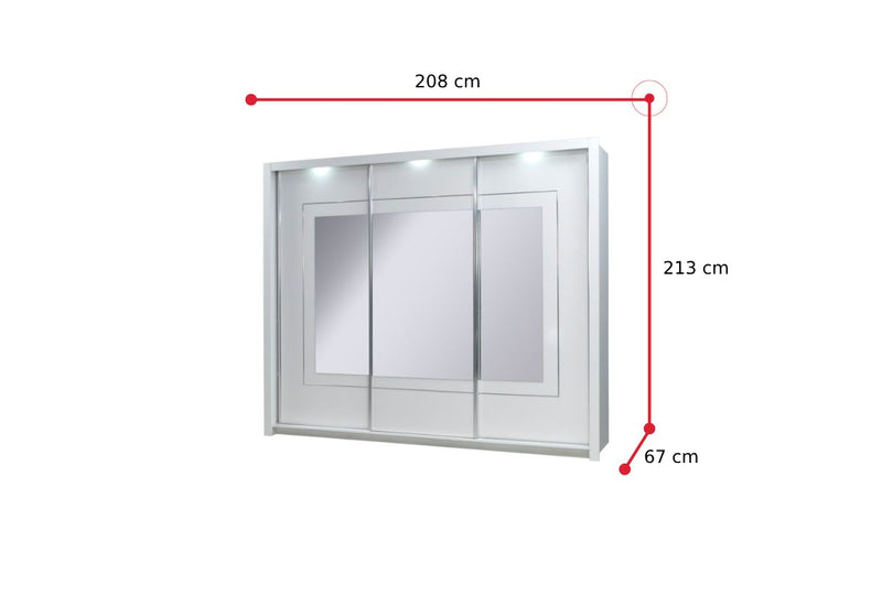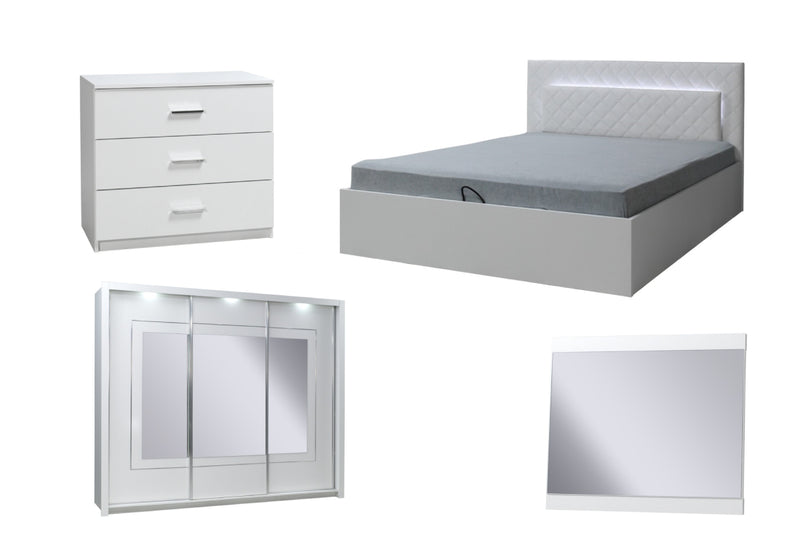 Spálňová zostava PANARA. Je vyrobená z kvalitného materiálu a vybavená ABS hranou. Tá ju chráni pred mechanickým poškodením a vlhkosťou. Čalúnené, prešívané čelo postele je doplnené štýlovým LED osvetlením, ktoré vykúzli príjemnú atmosféru v každej spálni. Dostatok úložného priestoru vám potom zaistí trojzásuvková komoda a veľká šatníková skriňa s piatimi policami a šatníkovou tyčou. Dvere šatníkovej skrine sú opatrené zrkadlami a LED osvetlením. Súčasťou setu je aj praktické zrkadlo. Vybrať môžete z dvoch veľkostí spacej plochy.