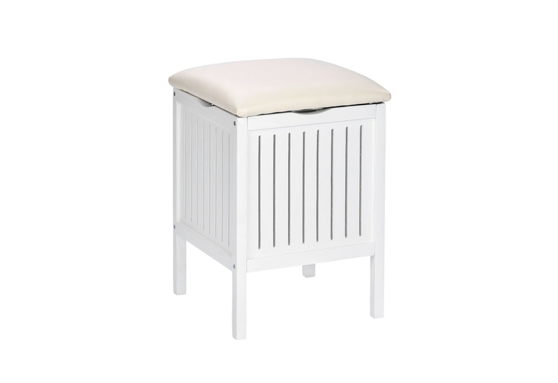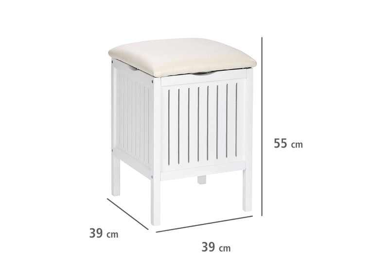 Taburet FRANK. Upúta elegantným škandinávskym štýlom. Vyrobený je z prírodného dreva v bielom dekore. Jednoduchý dizajn a praktické využitie. Taburet má vetracie otvory a otvárateľné horné veko. Súčasťou je úložný priestor a kvalitný polstrovaný mäkký sedák potiahnutý s príjemnou látkou na dotyk, zaistí komfort pri odpočinku. Stojí na vyšších nožičkách pre väčšiu stabilitu. Vhodný nielen do kúpeľne, ale aj do obývacej izby alebo predsiene.