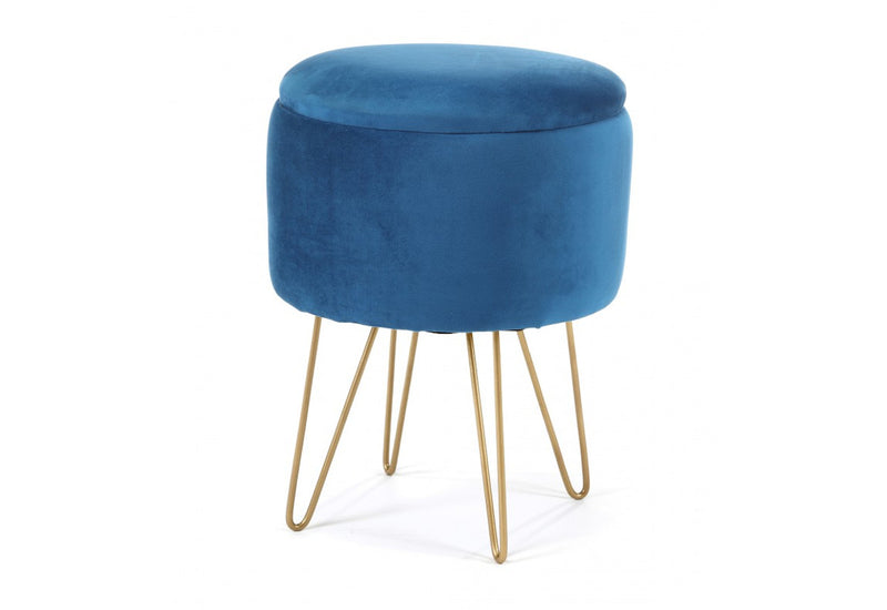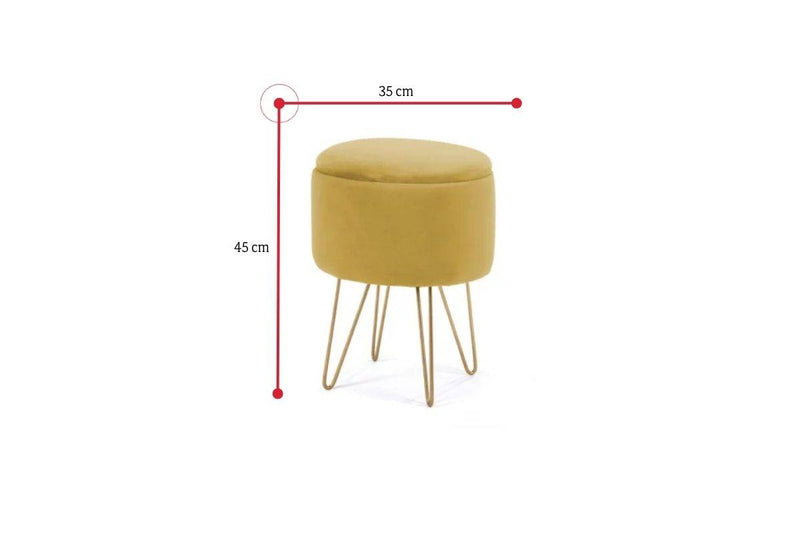 Taburet KORAD. Spojte príjemné s užitočným. Maximálne pohodlie počas sedenia je zabezpečené výplňou z PUR peny. Taburet je potiahnutý semišovou látkou, ktorá je nielen veľmi príjemná na dotyk, ale aj vkusná. Súčasťou taburetu sú elegantné kovové zlaté nožičky a úložný priestor. Taburet poslúži ako ďalšie miesto vo vašej obývačke. Vyberať si môžete z viacerých farieb.
