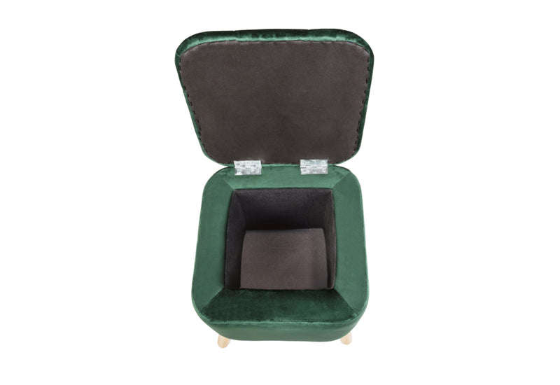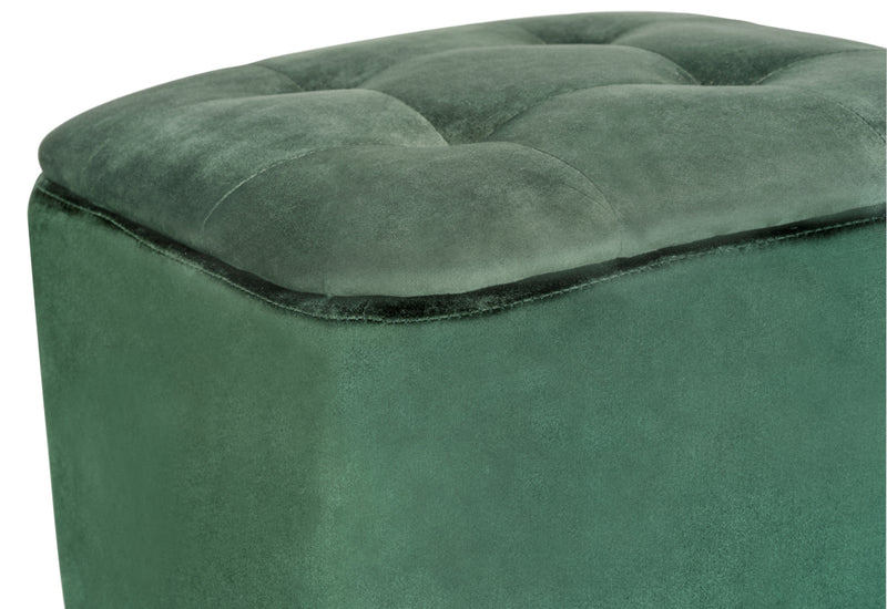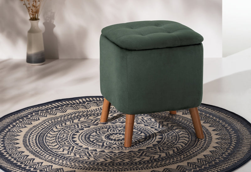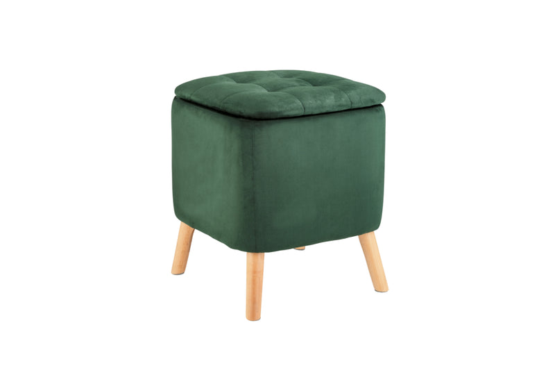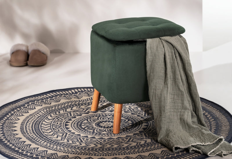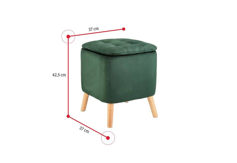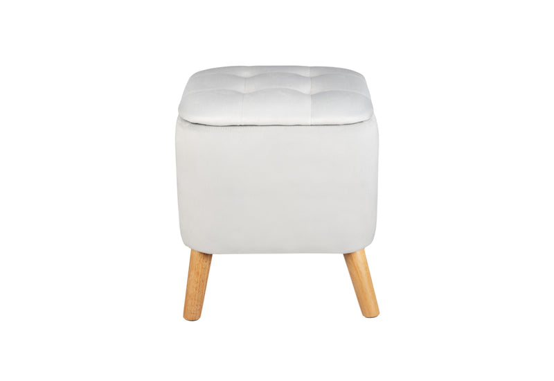 Taburet RENEE. Zaujme elegantným vzhľadom v škandinávskom štýle. Taburet je vyrobený z MDF dosky a potiahnutý na dotyk príjemnou zamatovou látkou z polyesteru. Odklápací sedák je ozvláštnený prešitím. Poskytuje úložný priestor. Stabilitu a vzdušnosť zaisťujú vyššie drevené nožičky v prírodnom dekore. Jeho využitie je vhodné v predsieni,v spálni alebo v kúpeľni.