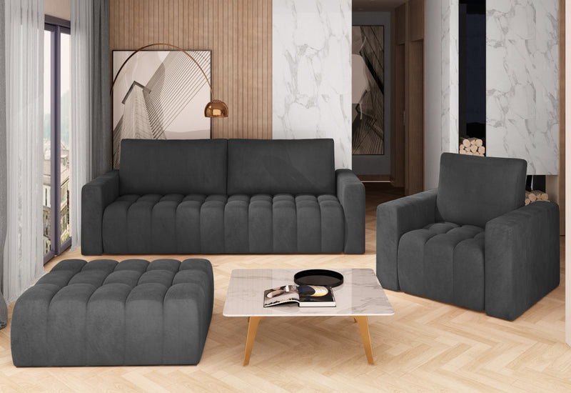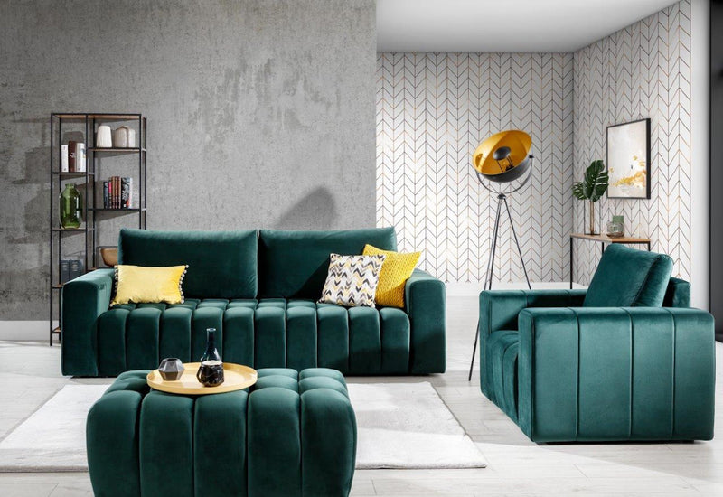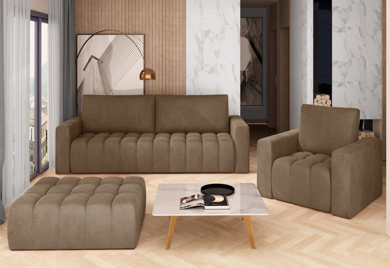 Taburet SALUTE. Disponuje priestrannou sedacou plochou, ktorej výplň tvorí pena T2130. Taburet sa tak stane pohodlným priestorom pre odpočinok. Ponuka zahŕňa niekoľko farieb. Je skvelým doplnkom k pohovkám a kreslám radu SALUTE.
