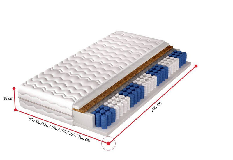 Taštičkový matrac VADA. Matrac je rozdelený do 7 zón tvrdosti. Zónovanie matraca znamená, že matrac je rozdelený do siedmich zón s odlišnou tuhosťou. Taštičkové pružiny sú z jednej strany potiahnuté kokosovou rohožou 1 cm s filcom a penou T25 s hrúbkou 2 cm a tiež z druhej strany je pena T25 s hrúbkou 2 cm. Tvrdosť spacej plochy si zvolíte podľa vami vybranej strany matraca, matrac ponúka dva druhy tvrdosti. Taštičkový matrac je obojstranný, opatrený prateľným poťahom na 40 °C. Výška matraca je 19 cm vrátane poťahu.