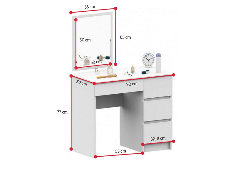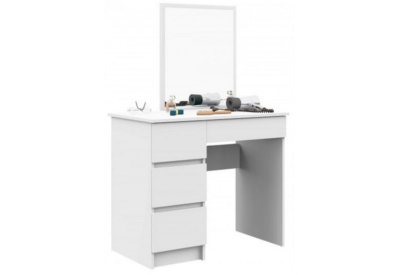 Toaletný stolík SPLIT T6 je vyrobený z vysokokvalitného materiálu s ABS hranami. Tým sa chráni pred možným mechanickým poškodením a vlhkosťou. Toaletný stolík obsahuje štyri zásuvky a nad jeho hornou časťou nájdete zrkadlo. Môžete si vybrať pravú alebo ľavú orientáciu.