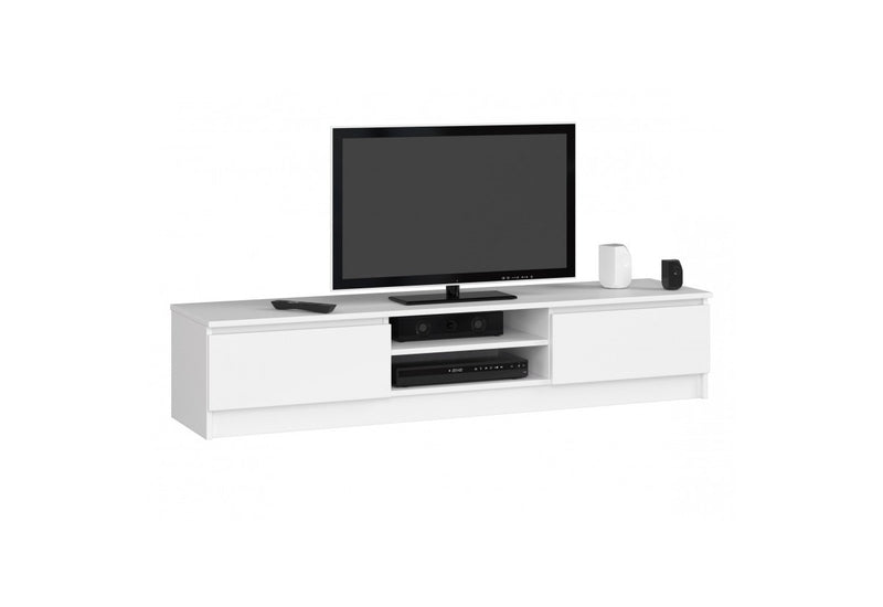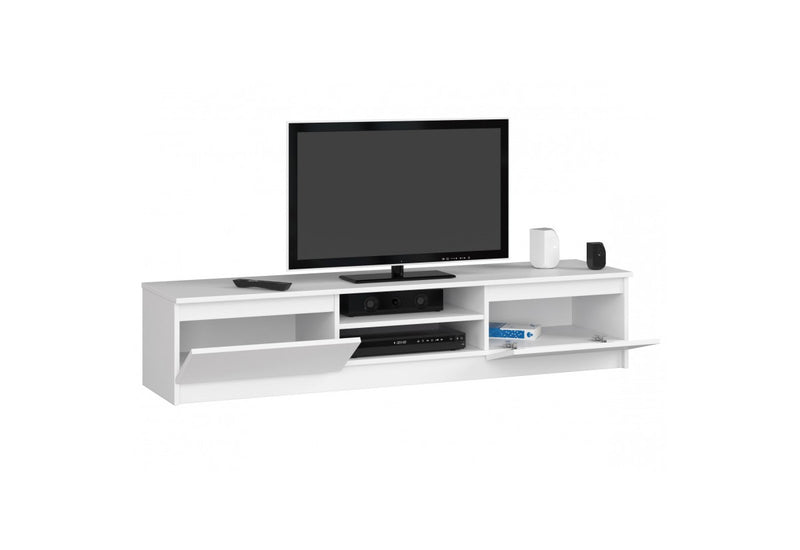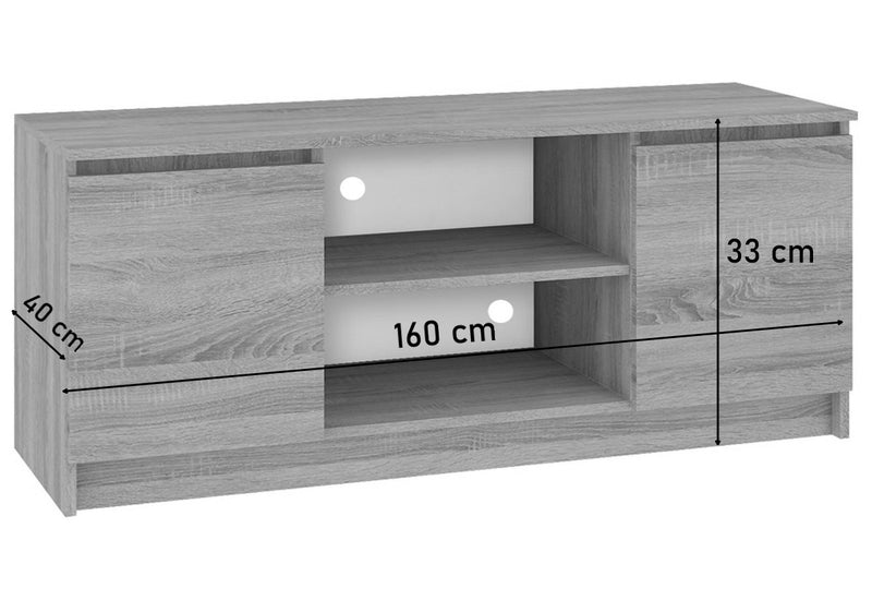 TV stolík RUTH RTV 160. Je vyrobený z kvalitného materiálu hrúbky 16 mm. ABS hrany chráni materiál pred mechanickým poškodením. Úložný priestor je rozdelený do dvoch výklopných dvierok, medzi ktorými sa nachádza odkrytá časť rozpolená poličkou.
