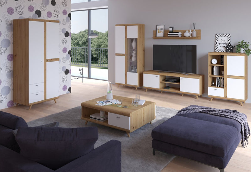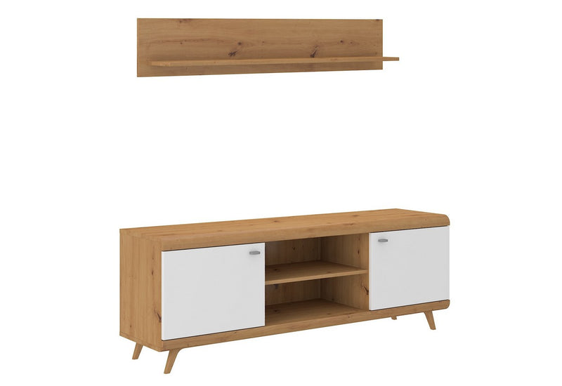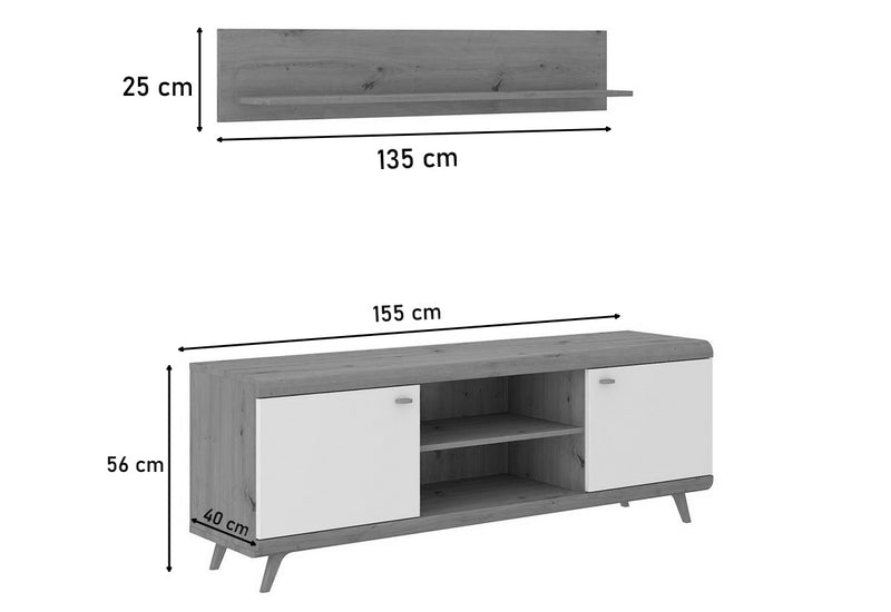 TV stolík a police DIORA. Sú vyrobené z kvalitného lamina. TV stolík disponuje dvoma dvierkami, medzi ktorými je nekrytý priestor rozdelený poličkou. Komplet stojí na drevených nožičkách. Páči sa vám tento štýl nábytku? Potom rozhodne stojí za to sa pozrieť aj na naše ďalšie produkty zo série DIORA.