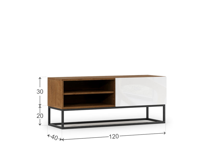TV stolík AVARIO.Elegantný TV stolík v industriálnom štýle. Súčasťou TV stolíka sú dve otvorené police a jedna uzavretá skrinka. Je vyrobený z kvalitného materiálu a stojí na kovovej konštrukcii, ktorá dodáva stabilitu vzdušnosť. Možnosť na výbere dekoru.