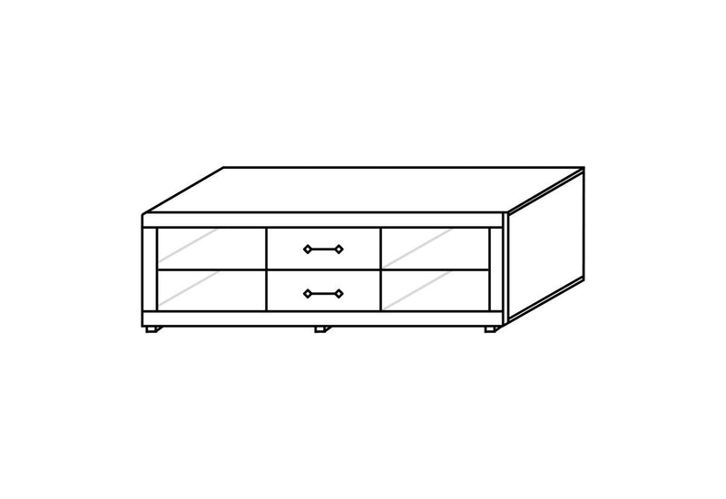 TV stolík BAHAN. Vyrobený je z kvalitného materiálu s hrúbkou 1,8 cm. Úložný priestor tvorí kombinácia dvoch priestranných zásuviek s otvorenými policami. Pre ľahšiu manipuláciu sú zásuvky opatrené úzkymi úchytmi v striebornej farbe. TV stolík stojí na nízkych nožičkách.