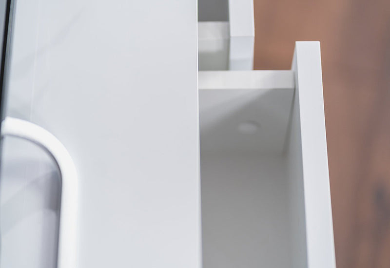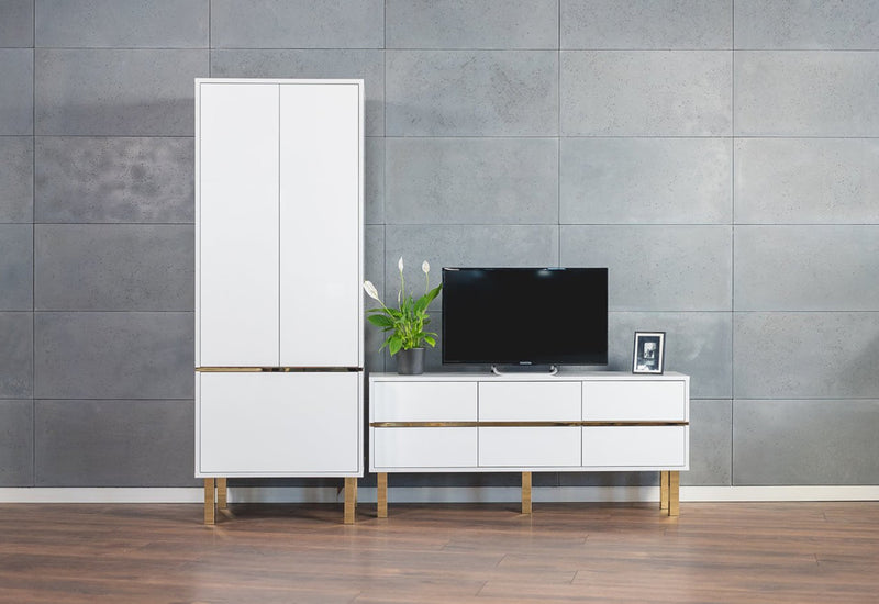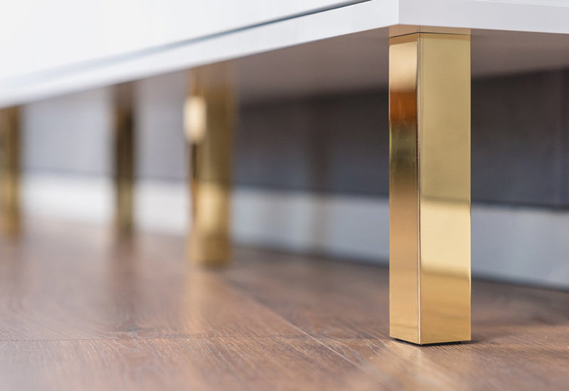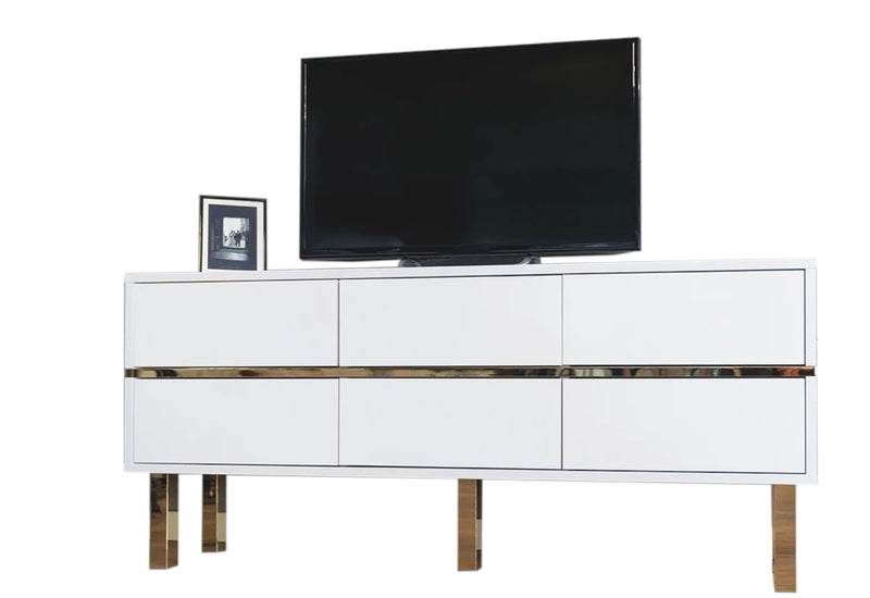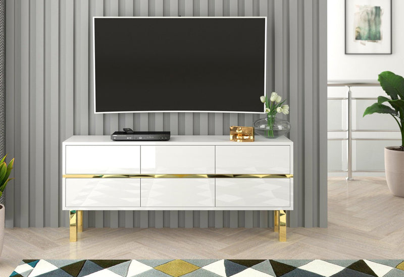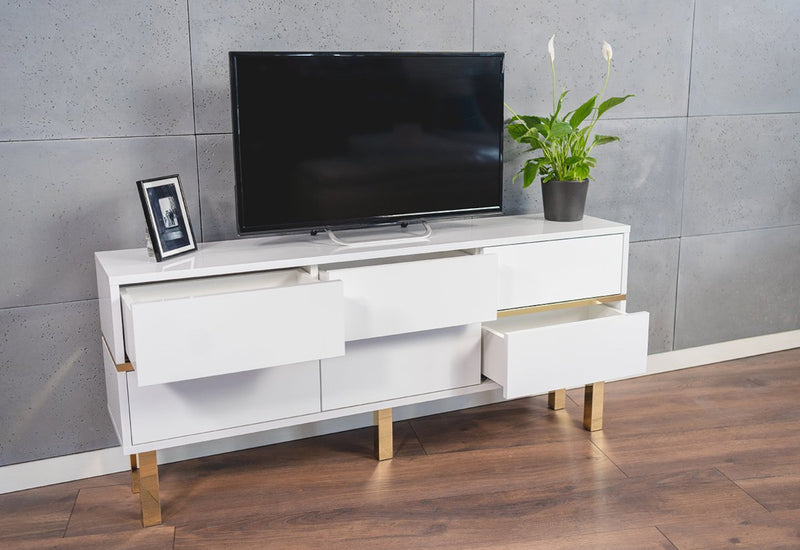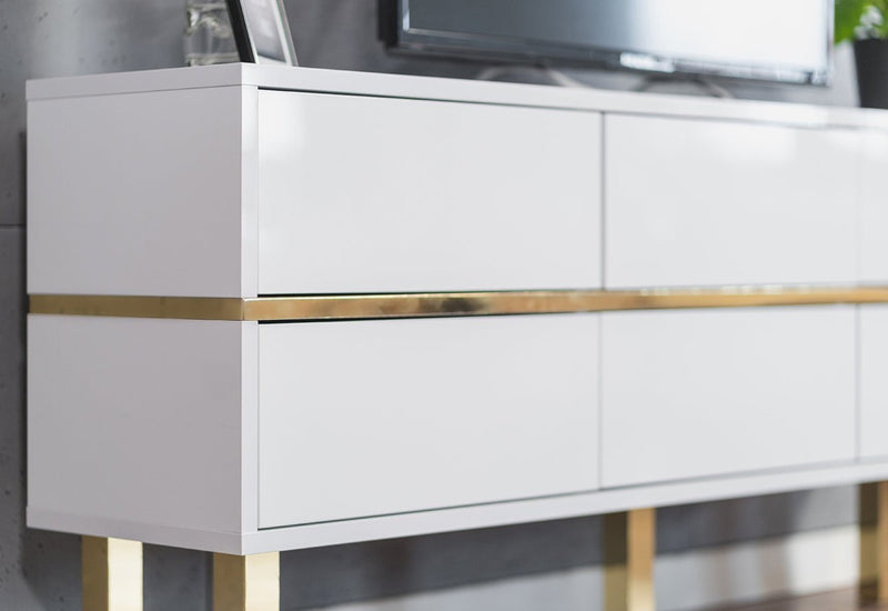 TV stolík DANCAN MATRAGI. Tvoria ho MDF dosky v bielom lesklom prevedení, ktoré sa vyznačujú vysokou odolnosťou pred mechanickým poškodením a vlhkosťou. Stolík ponúka dostatok úložného priestoru v podobe šiestich hlbokých zásuviek. Jemný tlak na prednú stranu otvára a zatvára zásuvku použitím systému PUSH TO OPEN. Komoda stojí na vysokých zlatých nožičkách.