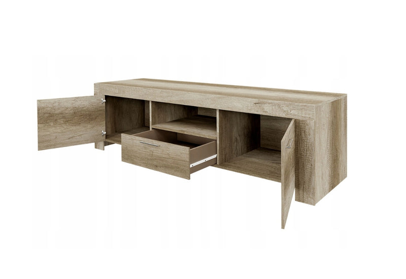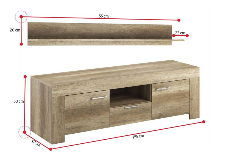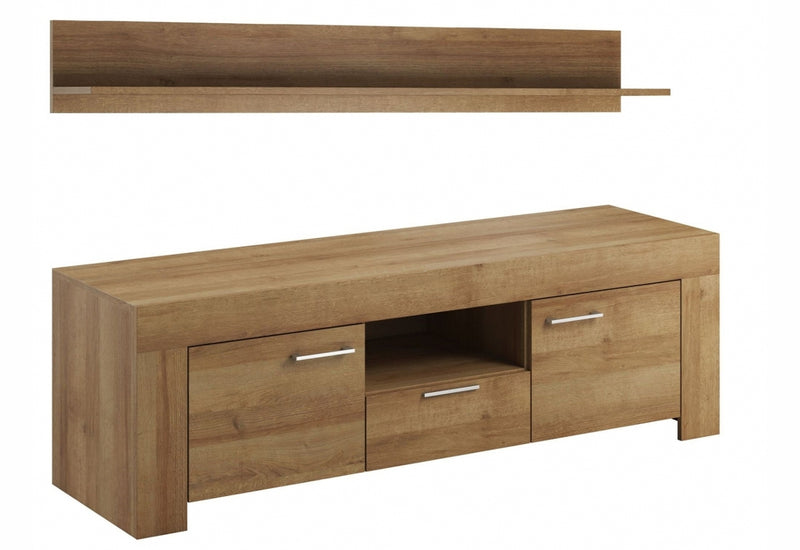 TV stolík FRESH SRTV 155 + polica prináša jednoduchý moderný dizajn. Konštrukcia je vyrobená z kvalitného materiálu, ktoré je opatrené ABS hranami. Tie chránia materiál pred mechanickým poškodením a vlhkosťou. Súčasťou stolíka je jedna malá uzatvárateľná a otvorená zásuvka, dve skrinky s dvierkami. Celú sadu tvorí TV stolík a polica v rovnakom dekore. Vybrať si môžete z dvoch prírodných dekorov.