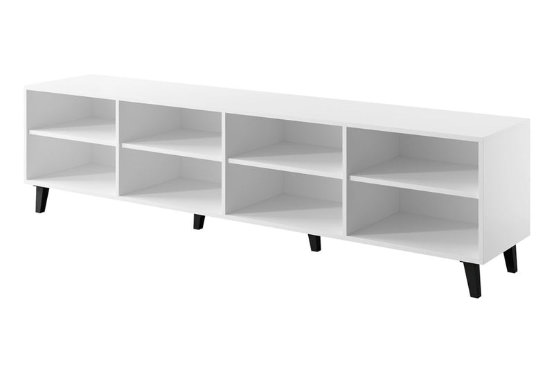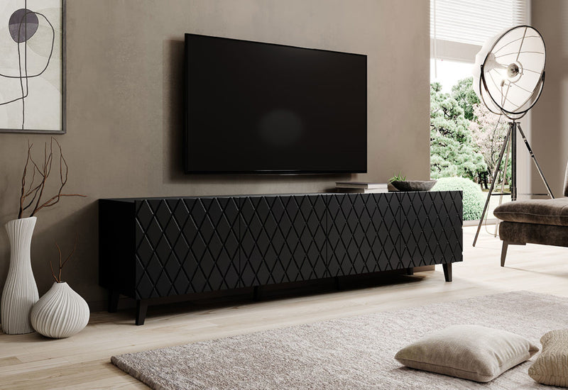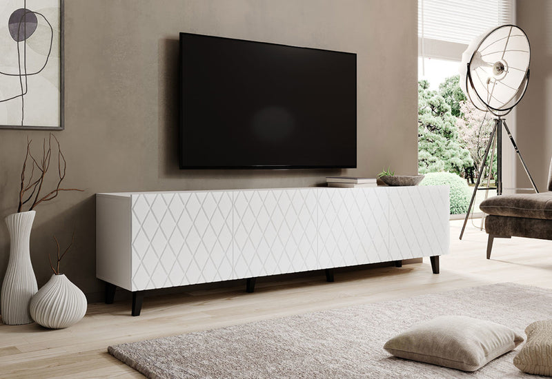TV stolík LEVI. Moderný vzhľad s jednoduchým dizajnom. TV stolík je tvorený z matnej dosky s frézovanými dvierkami s jemnými drážkami, ktoré ozvláštnia vzhľad TV stolíka. Geometrické usporiadanie vzorov vyzerá veľmi zaujímavo a elegantne. Dvierka mierne vyčnievajú nad vrchnú dosku. Vybavený ABS hranou, ktorá chráni pred mechanickým poškodením a vlhkosťou. TV stolík poskytuje veľké množstvo úložného priestoru v podobe štyroch skriniek rozdelených policami. Vysoké nožičky dodávajú stabilitu a vzdušnosť. Možnosť výberu z viacerých dekorov.