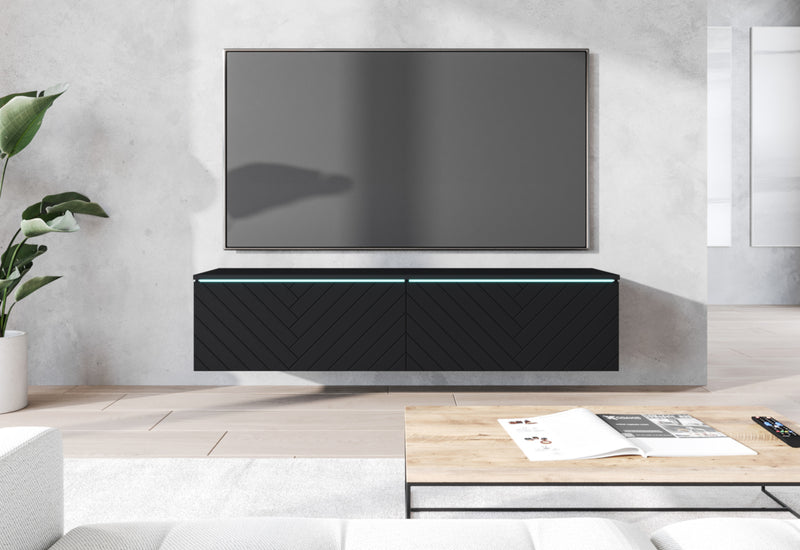 TV stolík MENDES D 2. Vás zaujme svojim originálnym dizajnom. Vyrobený je z kvalitného materiálu. Opatrený je ABS hranou, ktorá chráni materiál pred mechanickým poškodením a vlhkosťou. Súčasťou sú skrinky s vyklápacími dvierkami. Dvierka skriniek sú bez úchytov. Zvoliť si môžete aj variant s LED alebo bez LED osvetlenia.