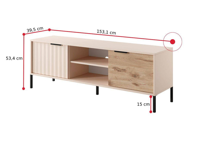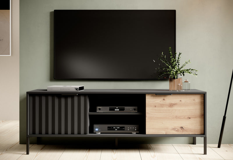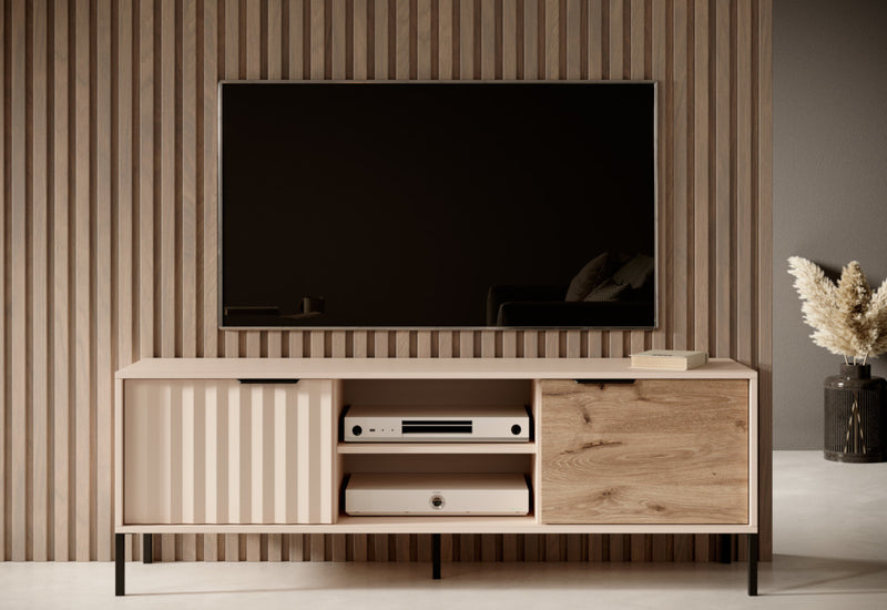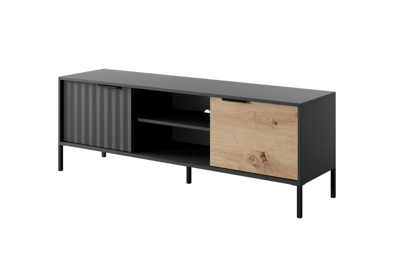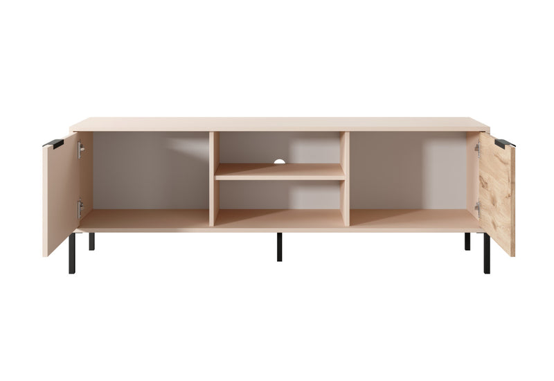 TV stolík RAME 2. Zaujme moderným dizajnom a kvalitným spracovaním. Je vyrobený z kvalitného materiálu a opatrený ABS hranami, ktoré chránia pred mechanickým poškodením a vlhkosťou. Stolík ponúka množstvo úložného priestoru v podobe dvoch skriniek s dvierkami a dvoch otvorených políc. Horná plocha poskytuje dostatok priestoru na umiestnenie televízie. Stojí na čiernych kovových nožičkách, ktoré mu dodajú stabilitu a vzdušnosť. Kombinovať môžete s ďalšími produktmi z radu RAME.