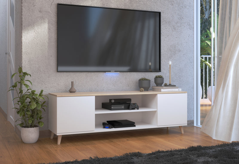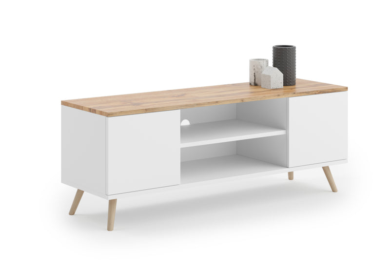 TV stolík ROXON 2. Vďaka svojmu jednoduchému a zároveň škandinávskemu dizajnu je vhodný do každého interiéru. TV stolík je vyrobený z kvalitného materiálu a stojí na vyšších drevených nohách. Pre väčšiu ochranu pred mechanickým poškodením a vlhkosťou je opatrené ABS hranami. Ponúka dostatok úložného priestoru v podobe otvorenej police a dvoch skriniek. Možnosť výberu z viacerých dekorov.