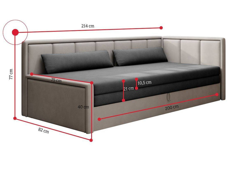 Váľanda FULGENO. Zaujme svojím moderným a nadčasovým dizajnom. Konštrukcia je vyrobená z kvalitného materiálu. Potiahnutá je kvalitnou látkou, ktorá je príjemná na dotyk. Pod spacou plochou je umiestnená prístelka s úložným priestorom. Pohodlie zaistí matrac vyplnený PUR penou T25. Súčasťou váľandy sú dva dekoračné vankúšiky. Táto váľanda sa bude skvele vynímať v každom interiéri. Možnosť výberu z viacerých čalúnení a orientácie.