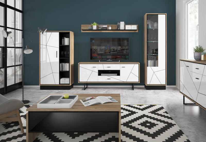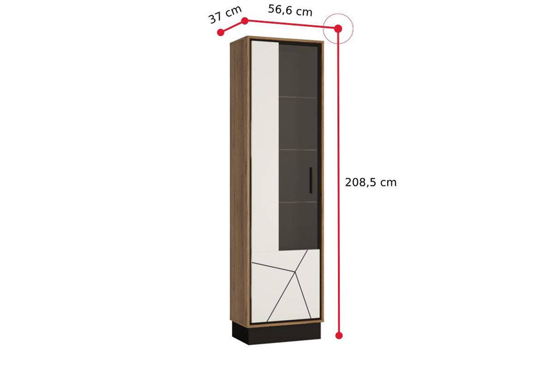 Vitrína BRONO 2. Vitrína Vás zaujme jednoduchým dizajnom v modernom štýle. Je vyrobená z udržateľného kvalitného materiálu. Pevná konštrukcia zaistí stabilitu a odolnosť proti poškodeniu. Vitrína disponuje úložným priestorom v podobe piatich políc. Dvere sú z časti presklené. Na výber z orientácie otvárania. Produkt môžete doplniť ďalšími produktmi z radu BRONO.