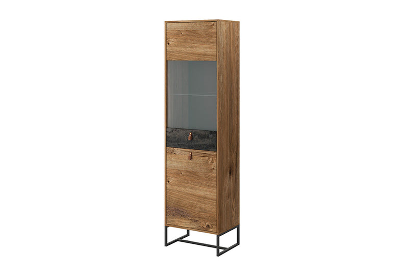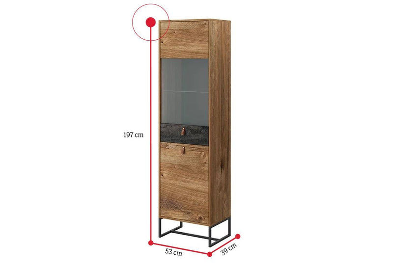 Vitrína BRUNO DWT 53. Moderný dizajn kombinovaný dvoma dekory na kovových nožičkách. Dvierka s koženými úchytmi a mosadzným kovaním. Je vyrobený z kvalitného materiálu hrúbky 1,6 cm. Opatreného ABS hranami, ktoré ochráni pred možným mechanickým poškodením a vlhkosťou. Vitrína ponúkne dvoje dvierka.