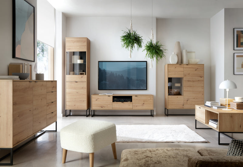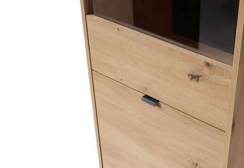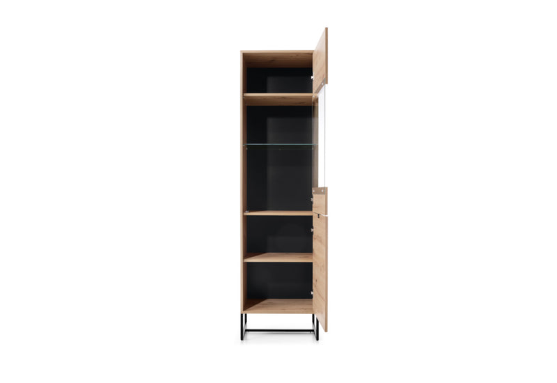 Vitrína CHAMBER. Vyrobená je z kvalitného materiálu s hrúbkou 1,6 cm. Vybavená ABS hranami, ktoré chránia pred mechanickým poškodením a vlhkosťou. Vitrína ponúka dostatok úložného priestoru v podobe políc na prehľadnejšie usporiadanie vecí. Tie sú schované za čiastočne presklenými dvierkami. Dvierka sú opatrené úchytom pre ľahšiu manipuláciu. Vitrína stojí na vyšších nožičkách pre väčšiu stabilitu.