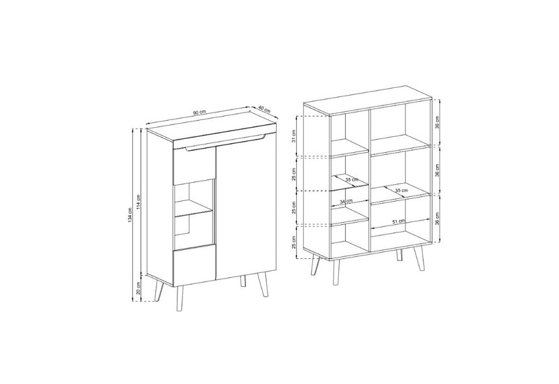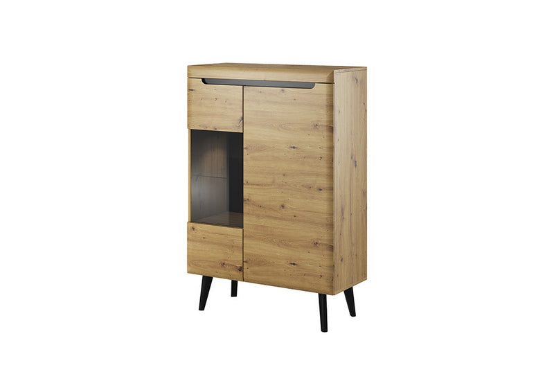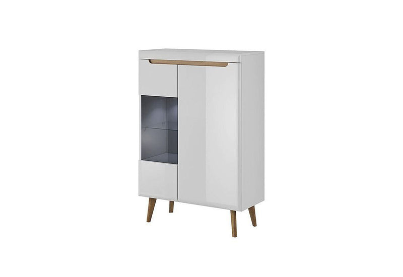 Vitrína GLUM NWT90. Je vyrobená z kvalitného materiálu opatreného ABS hranami. Tie materiál chráni pred mechanickým poškodením a vlhkosťou. Širší varianta vitríny na vysokých nôžkach kónického tvaru ponúka dostatok úložného priestoru. Ten je riešený ako polica schované za dlhými dvierkami. Stredná časť ľavých dvierok je presklená. V bielom matnom prevedení je vždy telo vitríny, zatiaľ čo prednej časti dvierok sú v lesku s doplnkami v prírodnom dekoru. Vitrína v prírodnom dekoru má doplnky vo farbe čiernej. K vitríne je možné dokúpiť LED osvetlenie.
