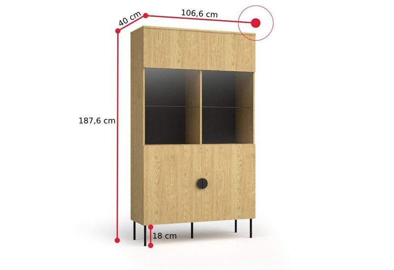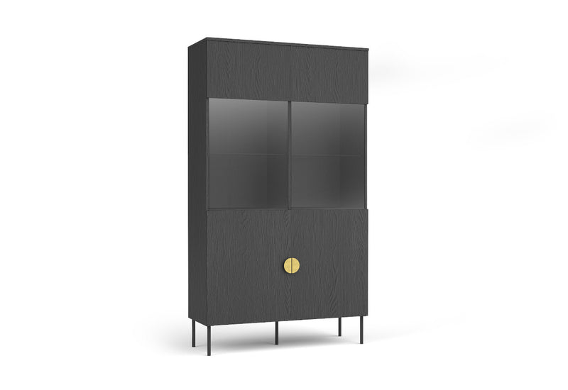 Vitrína LOND. Zaujme moderným dizajnom a kvalitným spracovaním. Je vyrobená z kvalitného materiálu a opatrená ABS hranami, ktoré chránia pred mechanickým poškodením a vlhkosťou. Vitrína ponúka množstvo úložného priestoru v podobe dvoch skriniek s dvierkami, ktoré sú rozdelené policami. Stojí na kovových čiernych nožičkách, ktoré zaručia stabilitu a vzdušnosť. Kombinovať môžete s ďalšími produktmi z radu LOND.