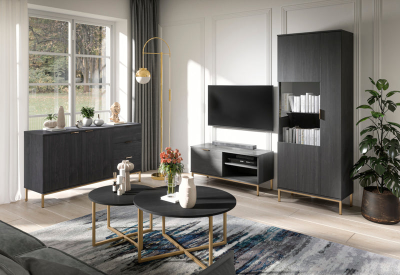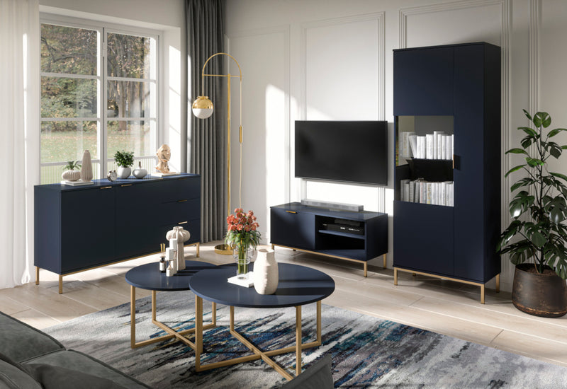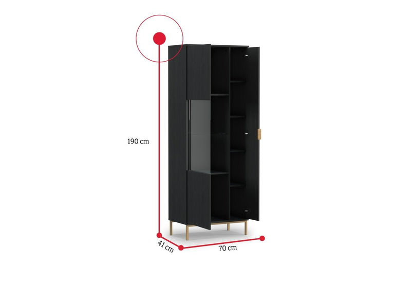 Vitrína MULA. Zaujme jednoduchými líniami moderného štýlu. Je vyrobená z kvalitných materiálov, ktoré sú opatrené ABS hranou. ABS hrana chráni pred mechanickým poškodením a vlhkosťou. Stabilitu a vzdušnosť zaistia vyššie kovové nohy. Čiastočne presklené dvierka sa otvárajú pomocou systému PUSH TO OPEN, plné dvierka majú úchytku v zlatej farbe. Vďaka svojmu vzhľadu nájde miesto v každom interiéri. Možnosť voľby z dvoch dekorov.