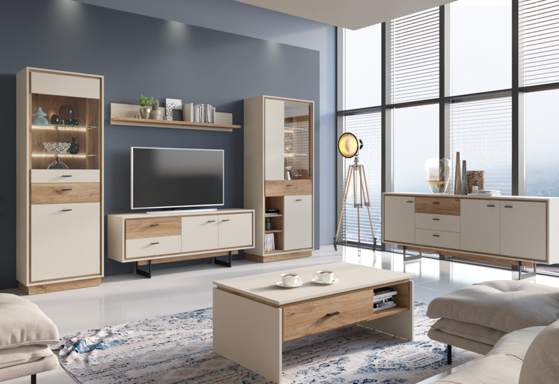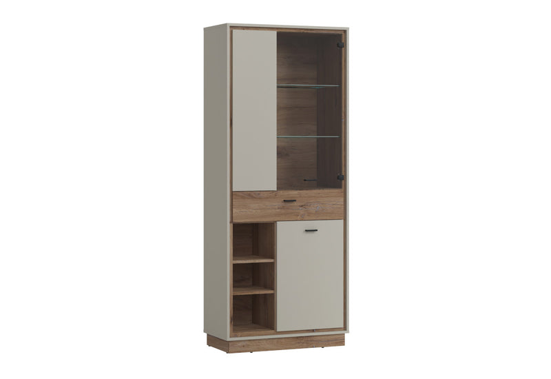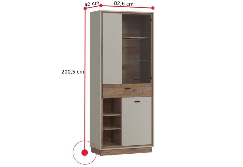Vitrína RIVAL 3. Zaujme svojím moderným dizajnom. Je vyrobená z kvalitného materiálu a opatrená ABS hranou, ktorá chráni materiál pred mechanickým poškodením a vlhkosťou. Poskytuje dostatok úložného priestoru v podobe jednej zásuvky a dvoch skriniek, z toho jedna s polopresklenými dvierkami. Sú rozdelené policami pre prehľadnejšie usporiadanie vecí. Kombinovať môžete s ďalšími produktmi z radu RIVAL.