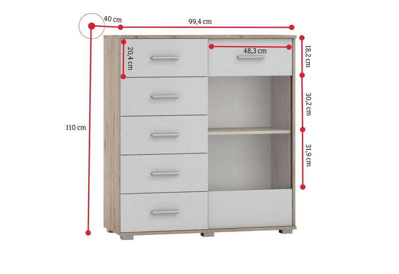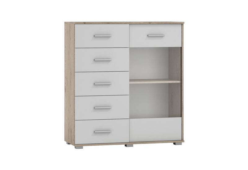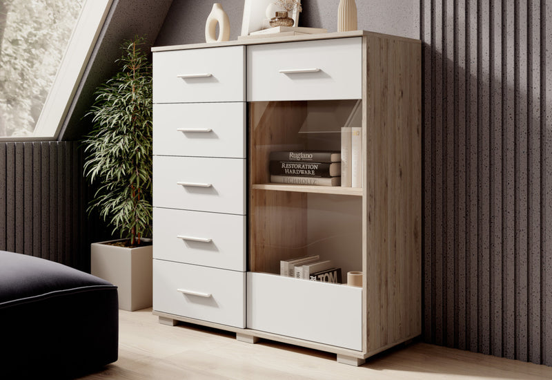 Vysoká komoda AKTUN 2. Vyrobená je z kvalitného materiálu s hrúbkou 1,8 cm. Poskytuje dostatok úložného priestoru v podobe piatich zásuviek a skrinky s čiastočne presklenými dvierkami. Skrinka je rozdelená policami pre prehľadnejšie usporiadanie vecí. Zásuvky aj dvierka skrinky sú opatrené úzkymi úchytmi v striebornej farbe. Komoda stojí na nízkych nožičkách.