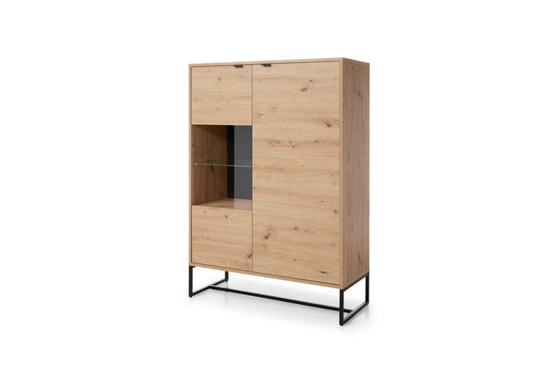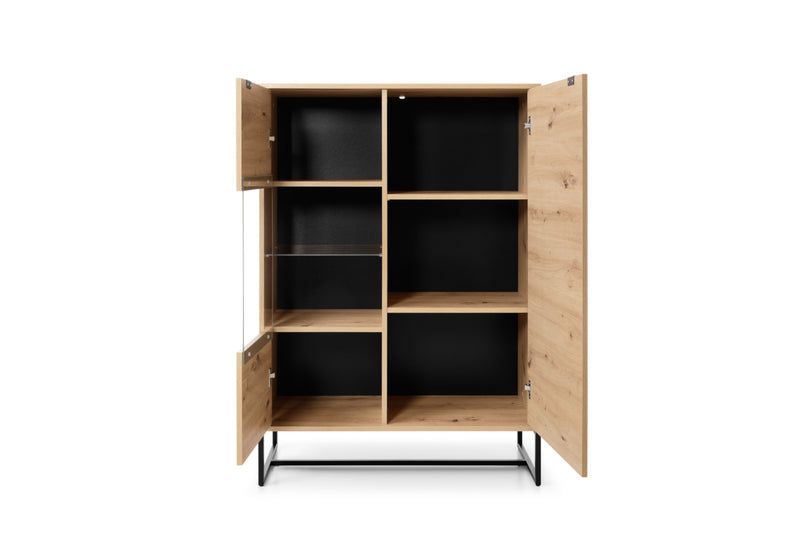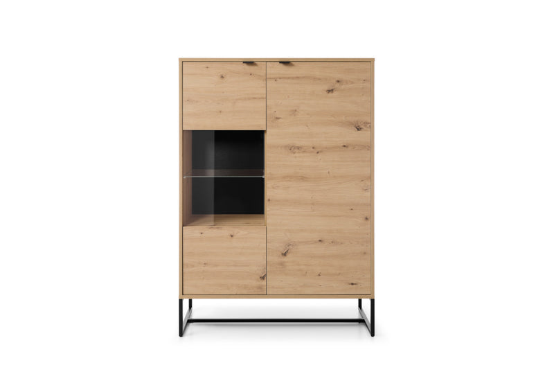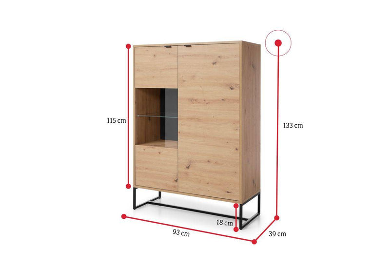 Vysoká komoda CHAMBER. Vyrobená je z kvalitného materiálu s hrúbkou 1,6 cm. Vybavená ABS hranami, ktoré chránia pred mechanickým poškodením a vlhkosťou. Vysoká komoda poskytuje dostatok úložného priestoru v podobe dvoch skriniek s plnými a čiastočne presklenými dvierkami. Skrinky sú rozdelené policami pre prehľadnejšie usporiadanie vecí. Dvierka skriniek sú opatrené úchytmi pre ľahšiu manipuláciu. Komoda stojí na vyšších nožičkách pre väčšiu stabilitu.