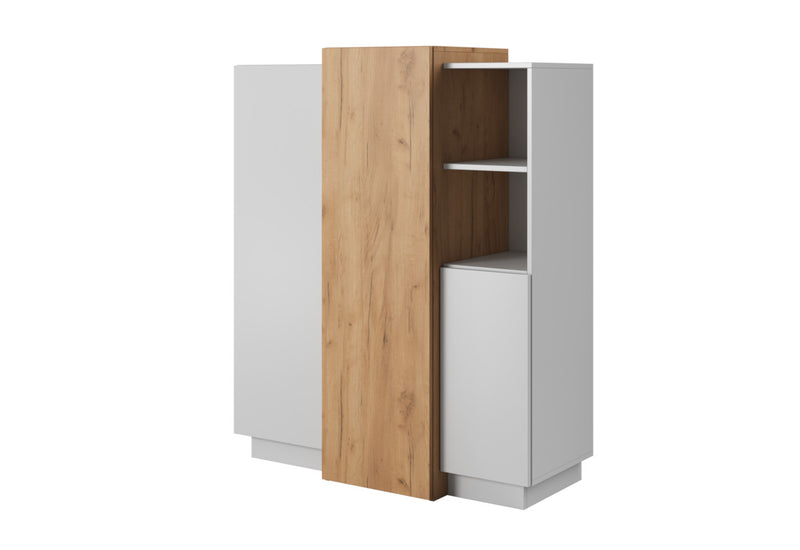 Vysoká komoda LAMU. Komoda Vás zaujme jednoduchým dizajnom v modernom štýle. Je vyrobená z udržateľného kvalitného materiálu. Pevná konštrukcia zaistí stabilitu a odolnosť proti poškodeniu. Komoda disponuje dostatkom úložného priestoru v podobe skriniek a otvorených políc. Dvierka skriniek nemajú úchytky, otvárajú sa pomocou systému PUSH TO OPEN. Produkt môžete doplniť ďalšími produktmi z radu LAMU.