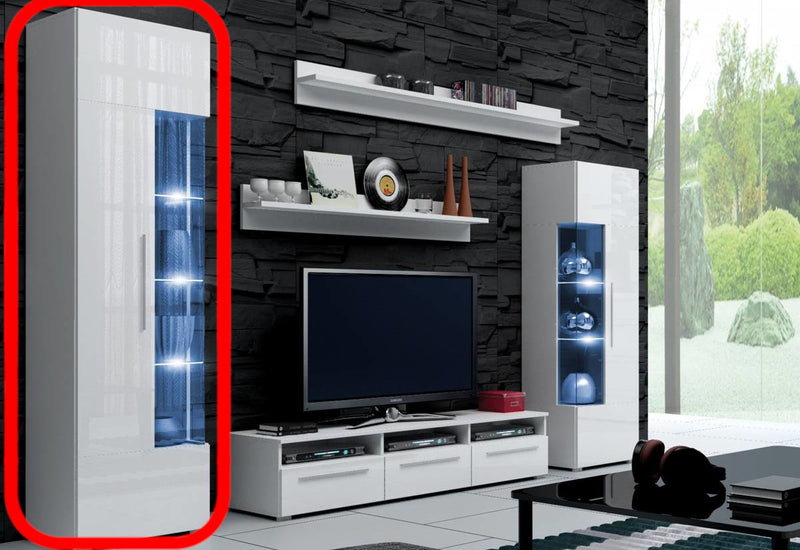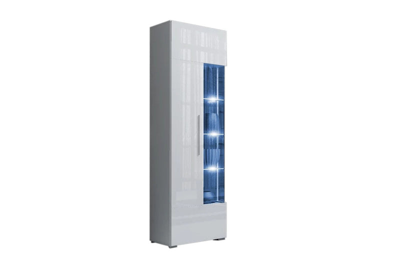 Vysoká vitrína LUGANO. Je vyrobená z kvalitných materiálov. Vitrína ponúka dostatok úložného priestoru, ktorý je riešený ako päť políc. Tie sú schované za čiastočne presklenými dvierkami. Dvierka sú vybavené PVC úchytom v striebornej farbe. Korpus vitríny je v bielom matnom dekore, zatiaľ čo predná strana dvierok je pokrytá akrylovou vrstvou, ktorá dodáva vysoký lesk. Vyberať si môžete zo štyroch farebných variantov. Súčasťou vitríny je LED osvetlenie.