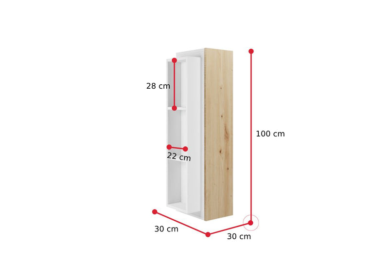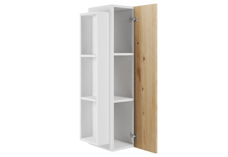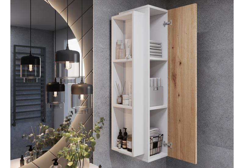 Závesná kúpeľňová skrinka SELAH. Je vyrobená z kvalitného materiálu a vybavená ABS hranou. Tá ju chráni pred mechanickým poškodením a vlhkosťou. Skrinka poskytuje dostatok úložného priestoru v podobe troch otvorených poličiek a ďalších troch poličiek za dvierkami. Dvierka skrinky sú v dekore dreva dub lefkas. Skrinka je určená na montáž na stenu a môžete vyberať z pravej či ľavej orientácie otvárania a dvoch farebných prevedení. Odporúčame kombinovať s ďalšími produktmi z toho istého radu.